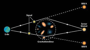 GravitationslinseGravitationslinsen resultieren aus dem Phänomen der Lichtablenkung durch Massen. Albert Einstein sagte bereits 1916 diesen Effekt durch die Allgemeine Relativitätstheorie voraus, Sir Arthur Stanley Eddington lieferte 1919 den experimentellen Beweis dazu. Oft kommt es zu einem weiteren Phänomen, einem sogenannten Einsteinring (siehe Abbildung rechts). Hierbei wird das Licht eines Objektes im Hintergrund um eine Gravitationslinse herum gebogen, wodurch es mehrfach dargestellt wird. Dabei muss allerdings lt. ART beachtet werden, dass die verschiedenen Geodäten unterschiedliche Wege um die Gravitationslinse zurücklegen, was sich auf deren Wellenlänge auswirkt. Um nun die für das Objekt gültige Wellenlänge zu ermitteln, werden computergestützte Raytracing Verfahren angewandt. |